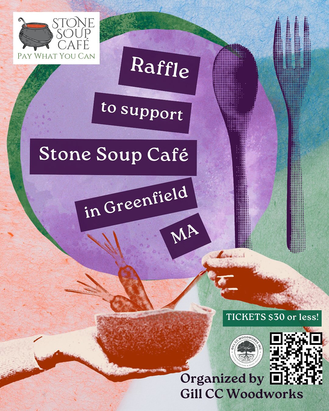 The Furnish & Feed raffle supports Stone Soup Café’s pay-what-you-can meals in Greenfield, with 100% of proceeds going directly to their community food program.