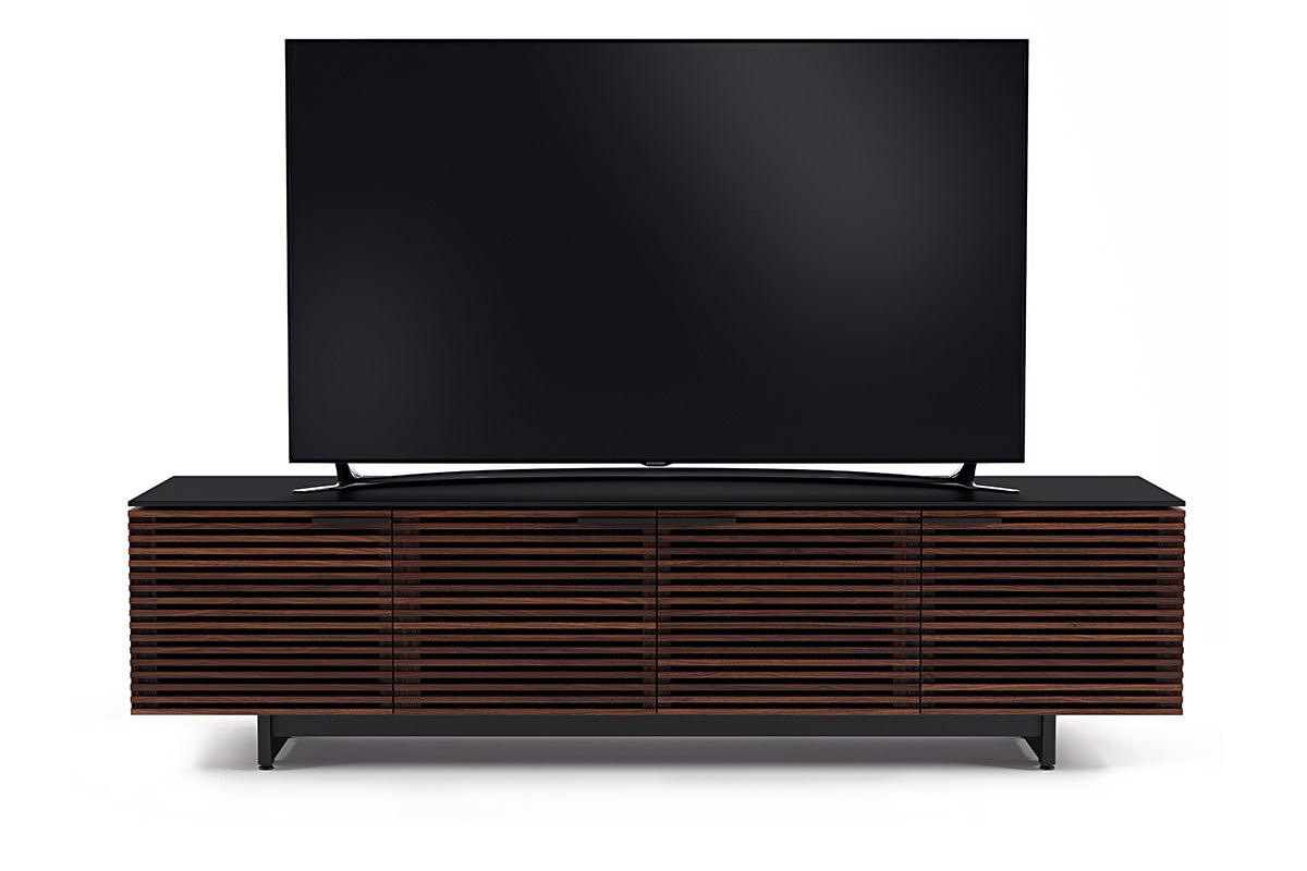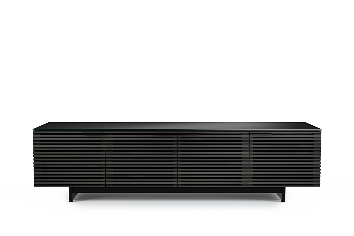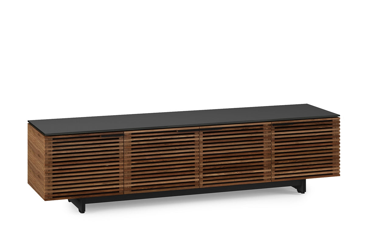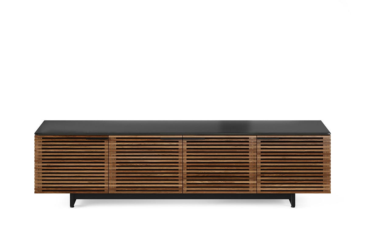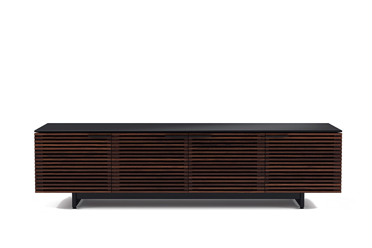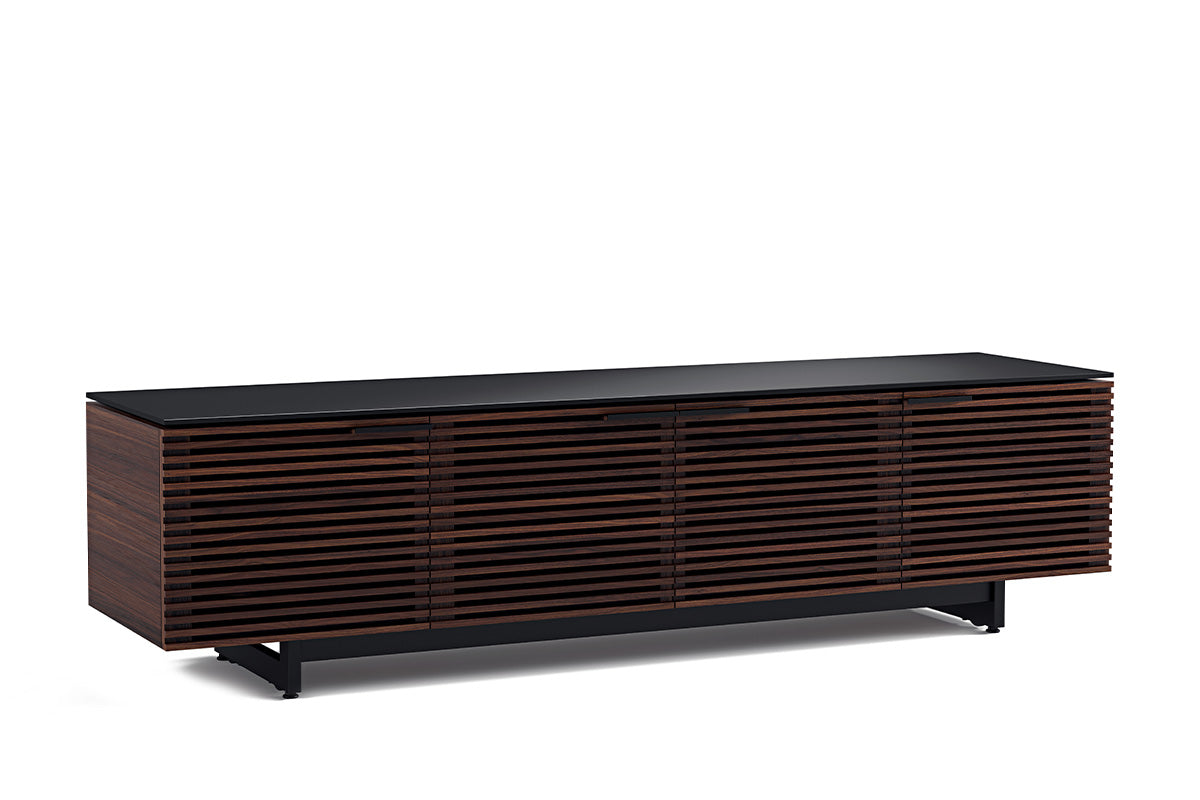 The Corridor 4 Door Media Cabinet is available in three wood finishes: Charcoal Stained Ash, Chocolate Stained Walnut, and Natural Walnut.