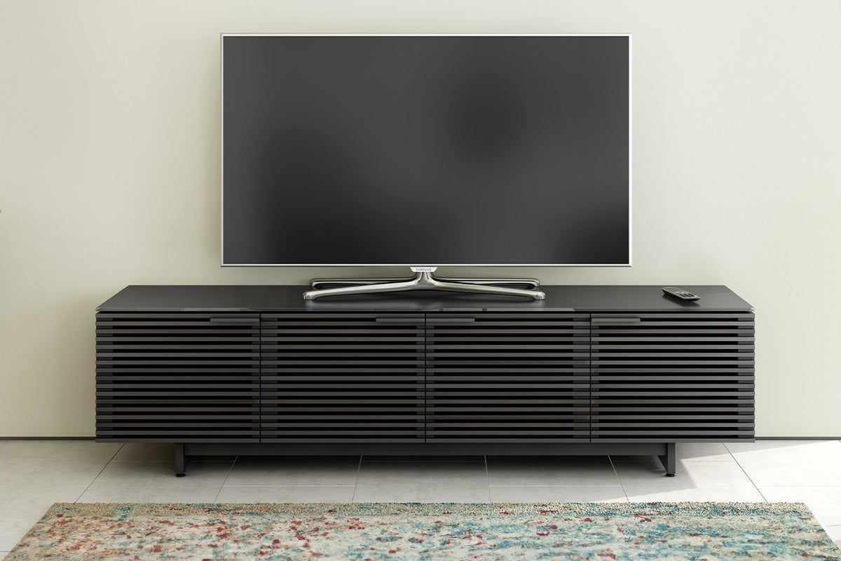The award-winning Corridor 4 Door Media Cabinet is beautifully crafted for any home. Featuring louvered hardwood doors, a satin-etched glass top, and a black steel base, it offers innovative design and practical user-friendly features.