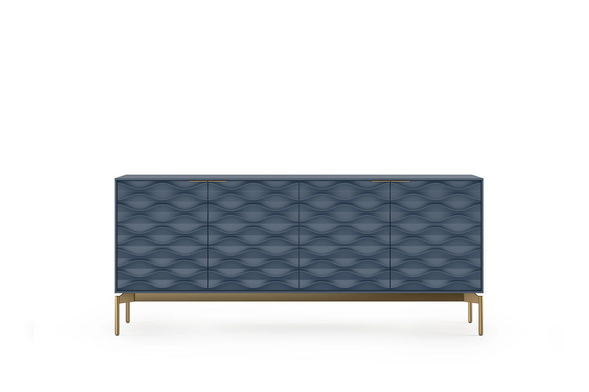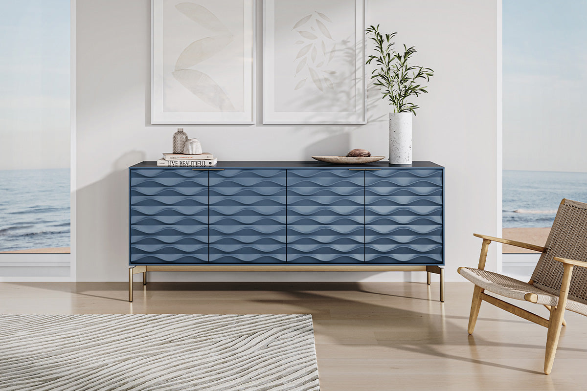 The Ripple Console is available in two finishes: Stone and Ocean. There are two leg finishes: Brushed Brass or Brushed Carbon.