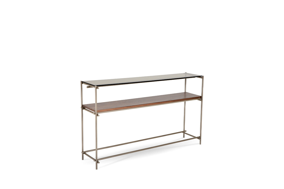 The Collins Console Table has the following options for the tabletop material: Glass (3/8"), Bronze Glass (3/8"). There is also a choice of shelf material: Glass, Maple, or Walnut. Each wood species has a variety of finishes.