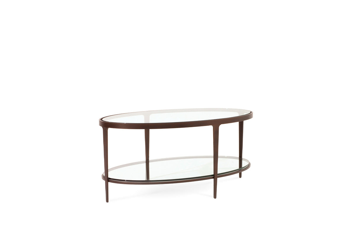 The Ellipse Cocktail Table combines understated style and value. It features an elegant oval glass top and lower shelf, both supported by sleek, tapered legs, creating a beautiful and functional design.