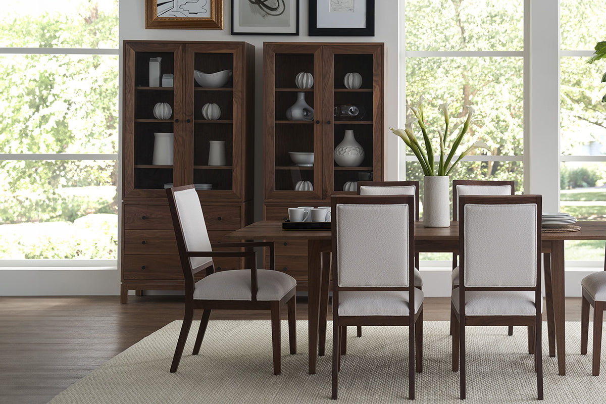 The Gerard Glass Cabinet is a buttoned-down classic that adds elegance to any dining space. Its unique "Dial" knob, inspired by vintage radio cabinets, sets the tone. Clean vertical lines and elegant glass panel doors beautifully showcase your favorite things.