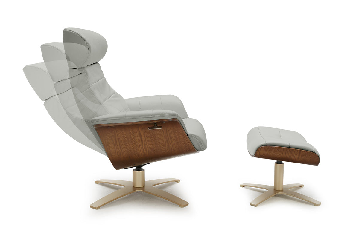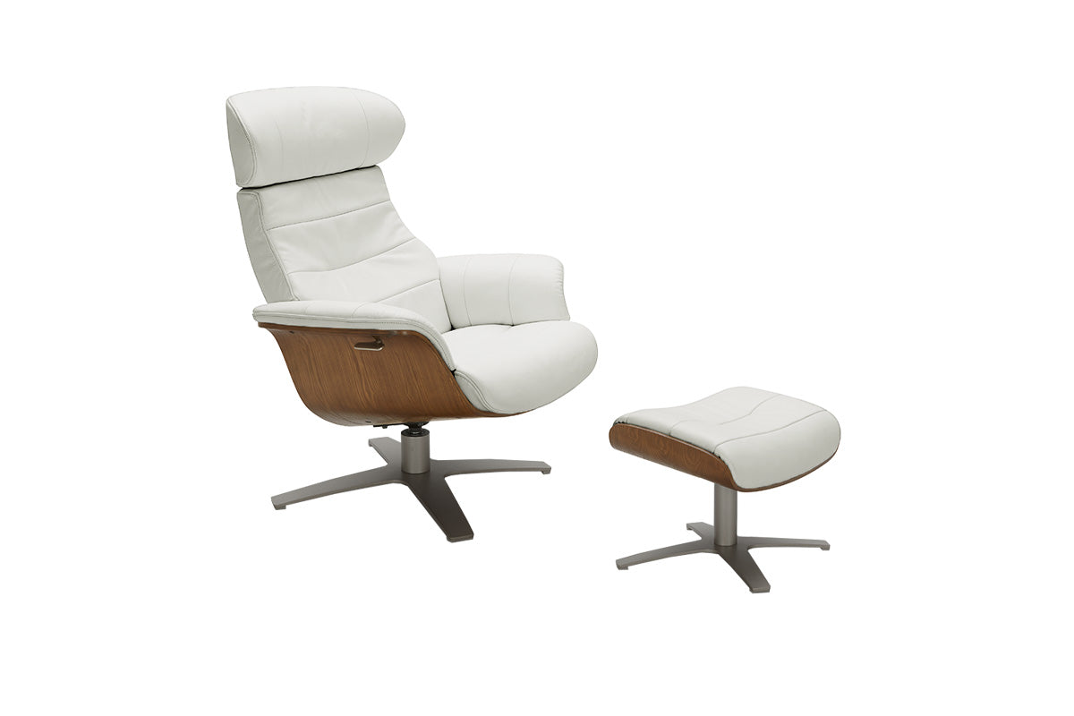 The Dylan Swivel Recliner offers sleek, contemporary comfort. Wrapped in white top-grain leather, it features warm nutmeg-stained wood accents and a sturdy grey metal base. An adjustable headrest ensures a perfect fit. Available for immediate enjoyment in our In-Stock Collection.