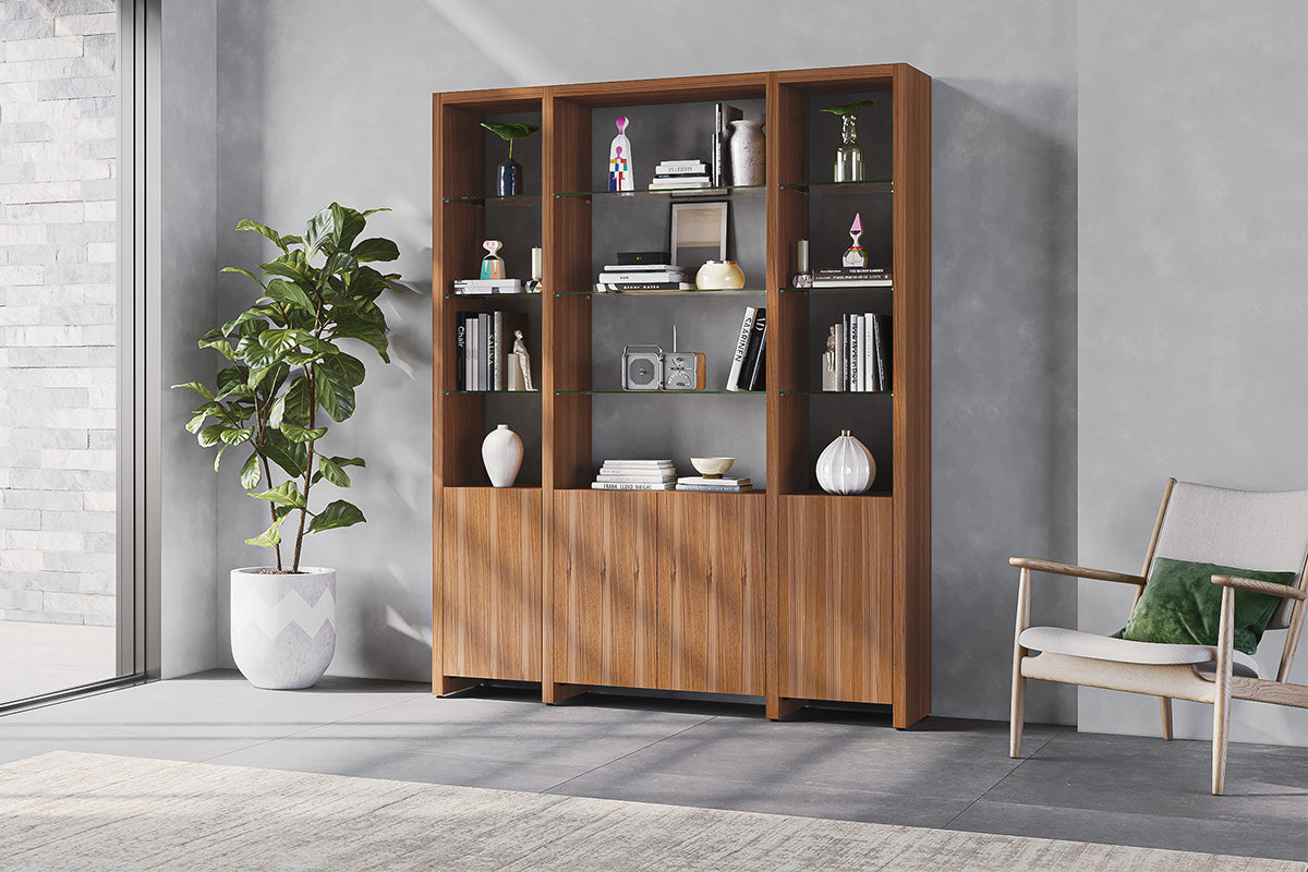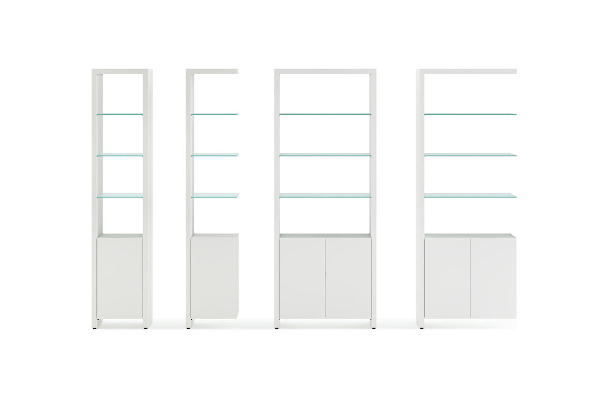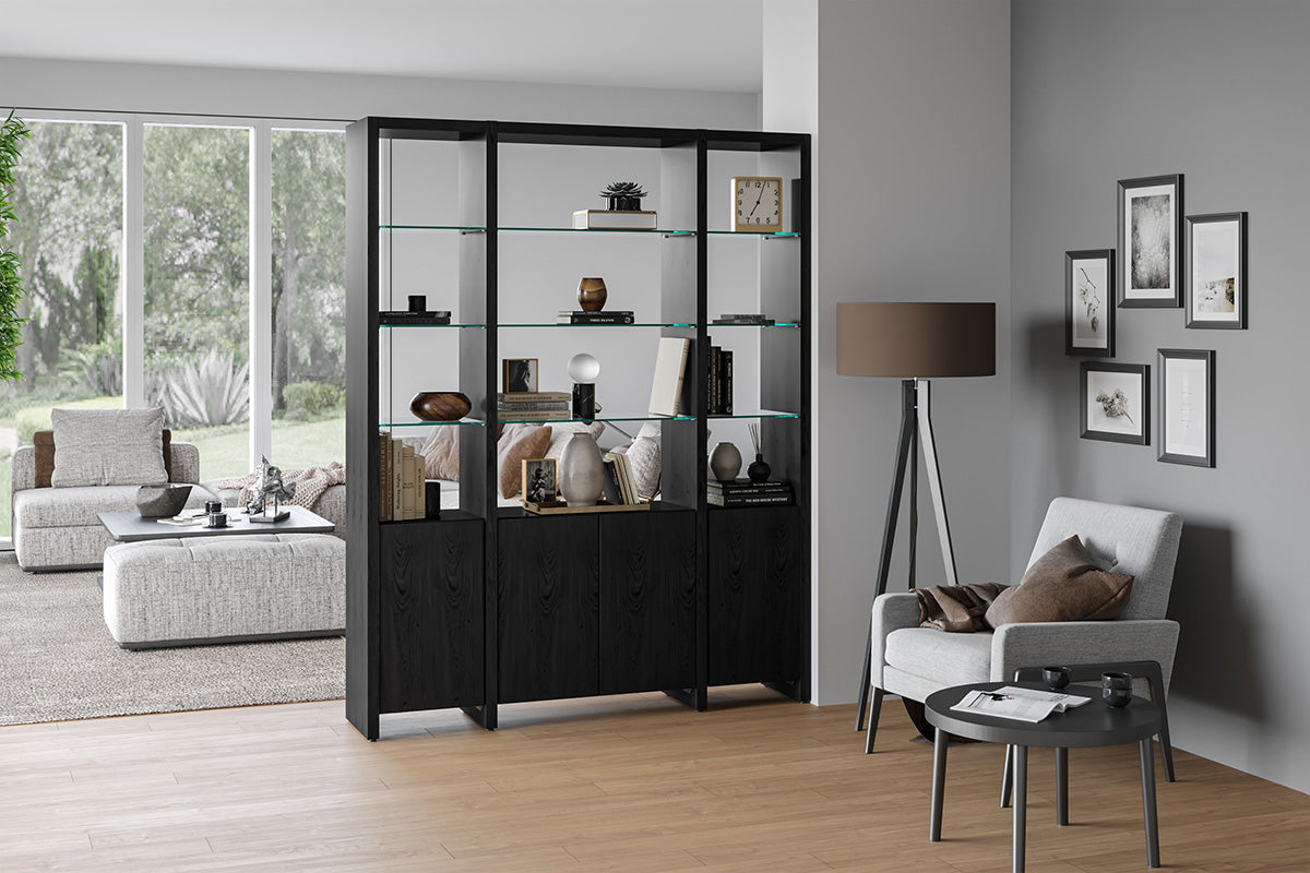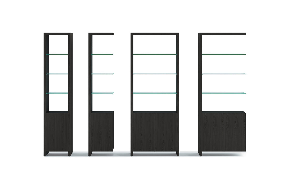 The Linea Shelving System offers versatile storage with floating glass display shelves and enclosed storage. Available in single or double widths, choose individual shelves, preconfigured systems, or customize by adding extension shelves to fit any space.