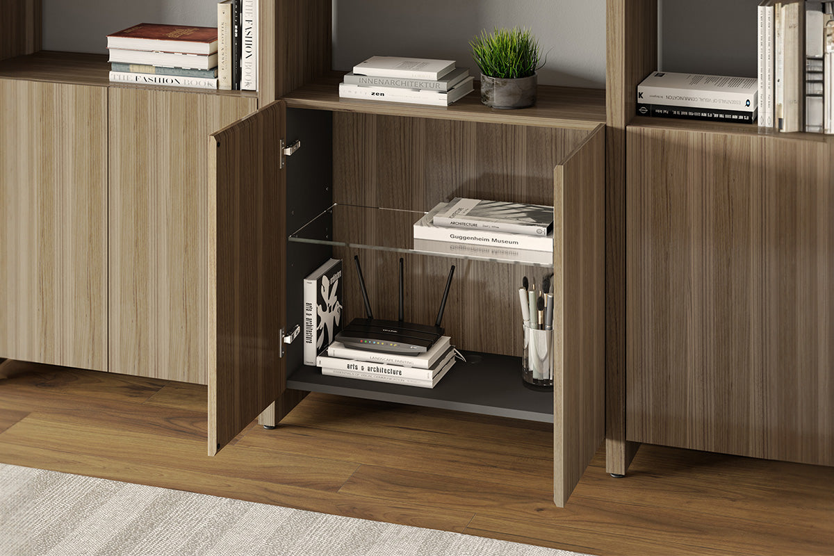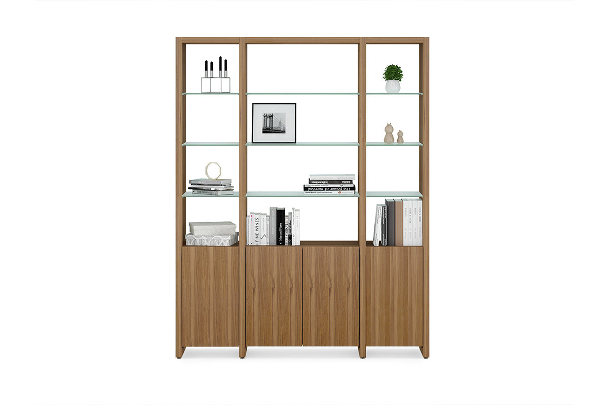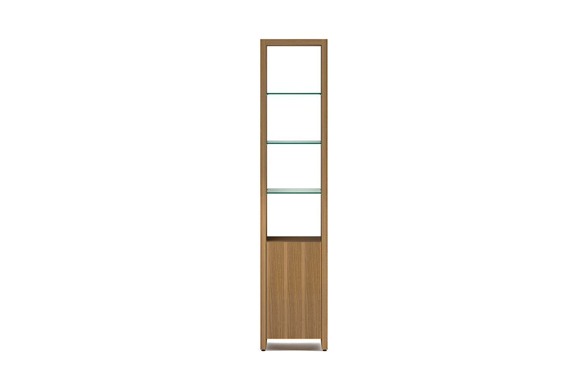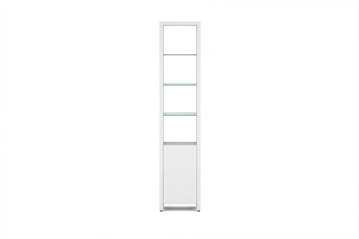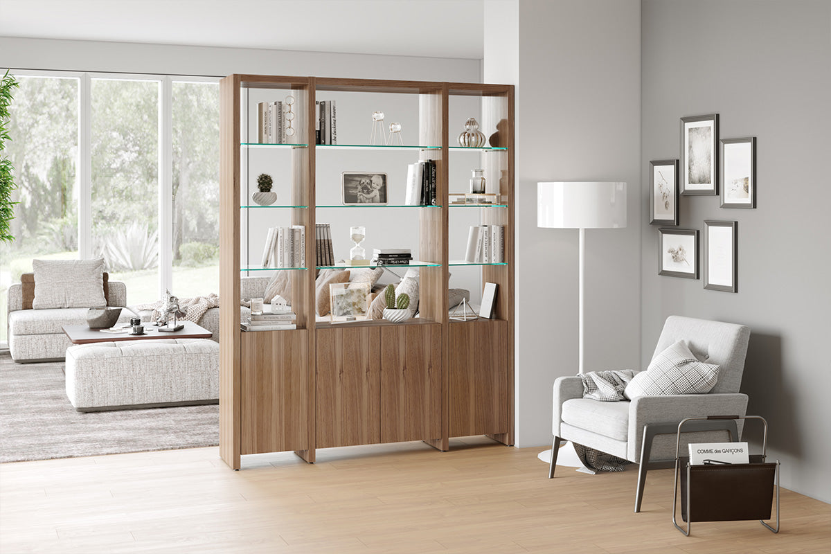 The Linea Shelving System offers versatile storage with floating glass display shelves and enclosed storage. Available in single or double widths, choose individual shelves, preconfigured systems, or customize by adding extension shelves to fit any space.