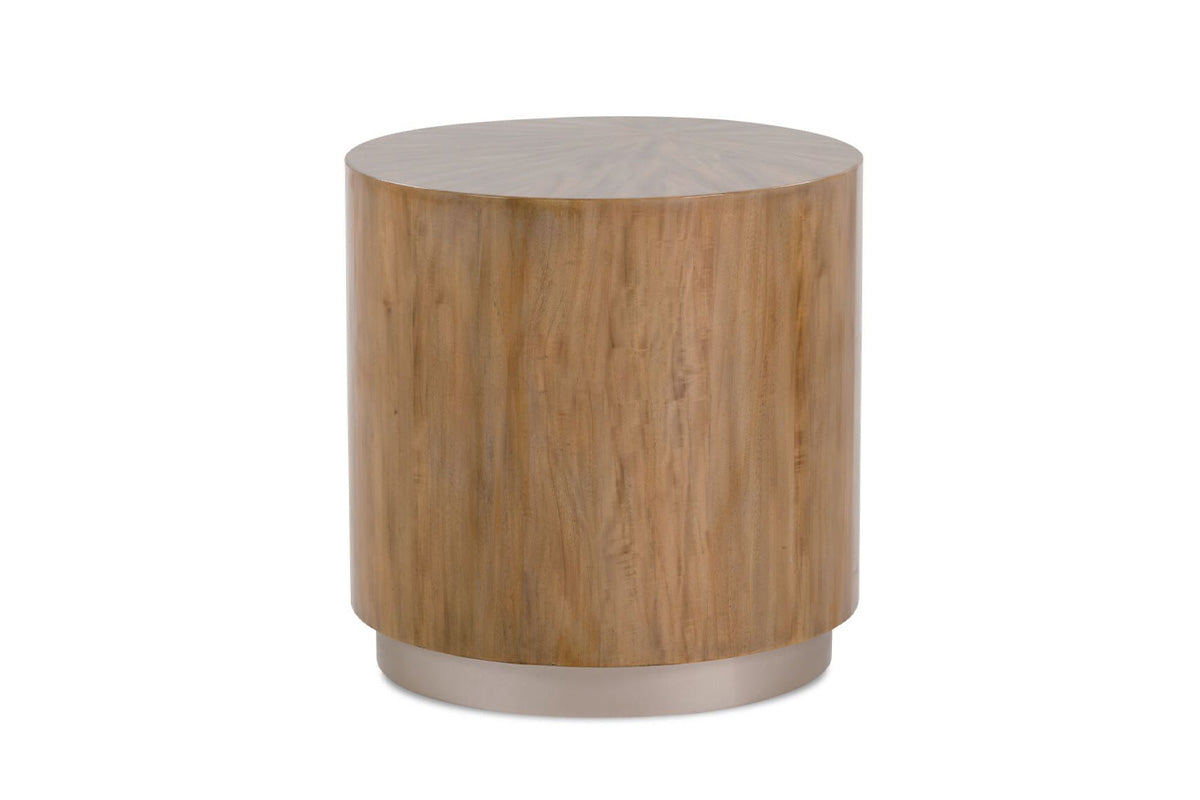 The Gemina End Table showcases a striking starburst primavera wood veneer on its round, log-like design. Its bold, organic form makes it the perfect accent piece, adding natural warmth and a modern touch to any space.