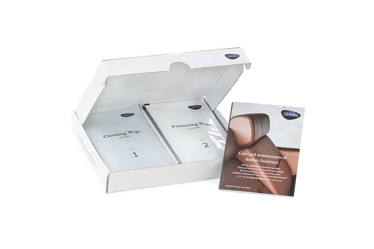 The Stressless Leather Care Kit helps keep Stressless leather in top condition. It includes a Leather Cleaner to remove dirt, a Leather Protector to condition, an application sponge, and a soft cloth for easy, thorough care.
